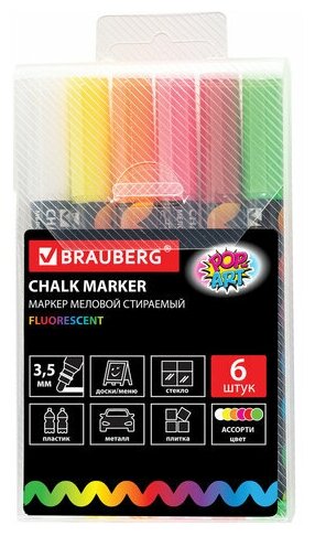 Комплект 5 шт, Маркеры меловые "POP-ART", набор 6 цветов, 3.5 мм, сухостираемые, для гладких поверхностей, BRAUBERG, 151526 информация: