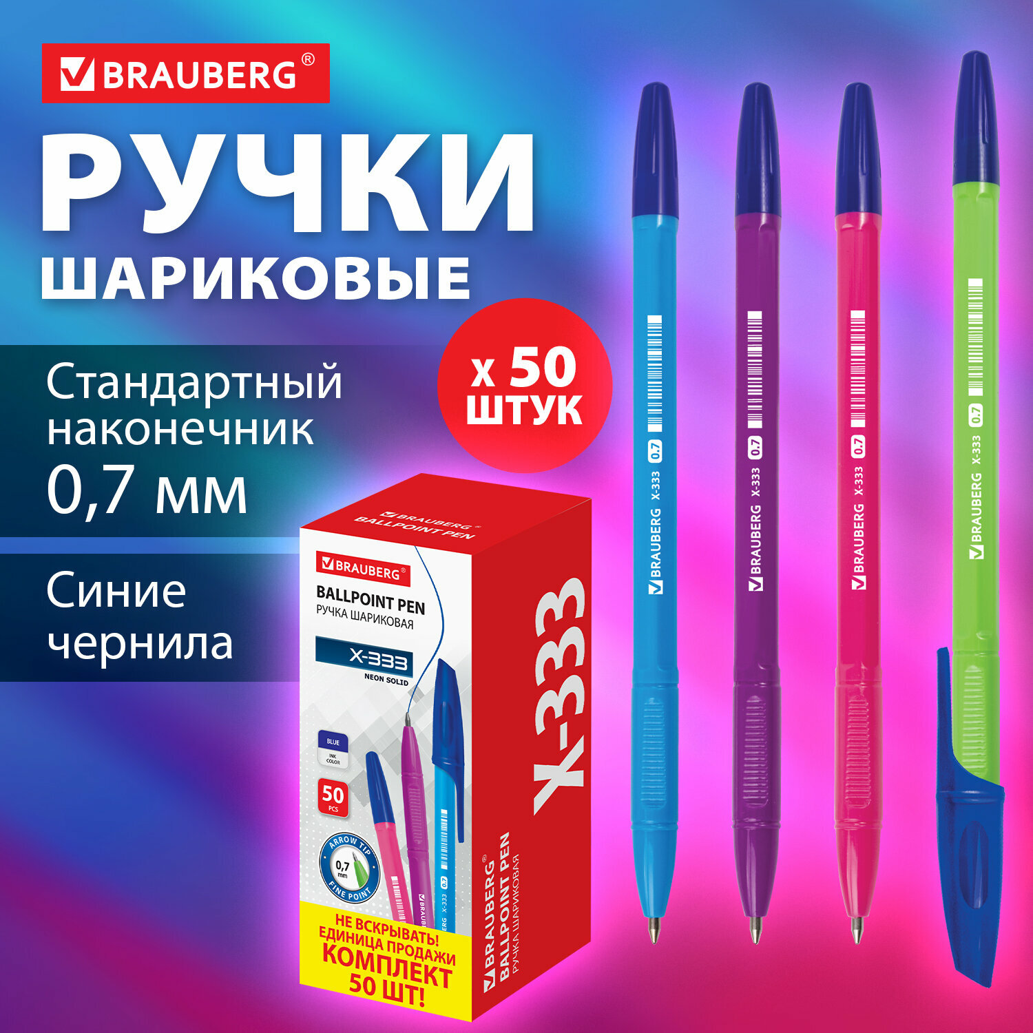 Ручка шариковая Brauberg X-333 Neon Solid, синяя, Выгодный Комплект 50 штук, линия 0,35мм, 880729 информация: