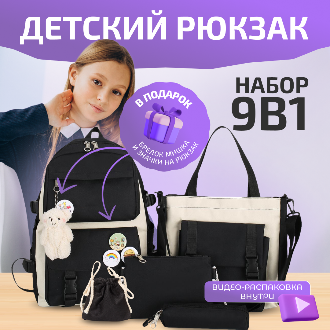 Отзывы на Рюкзак школьный Набор 9 в 1: Стильный и Модный, для Девочек и Мальчиков, идеально подходит для Школы, Туризма и Спорта, Повседневный. Черный