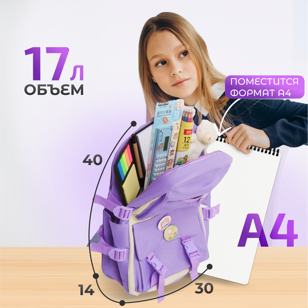 Отзывы на Рюкзак школьный Набор 9 в 1: Стильный и Модный, для Девочек и Мальчиков, идеально подходит для Школы, Туризма и Спорта, Повседневный. Сиреневый