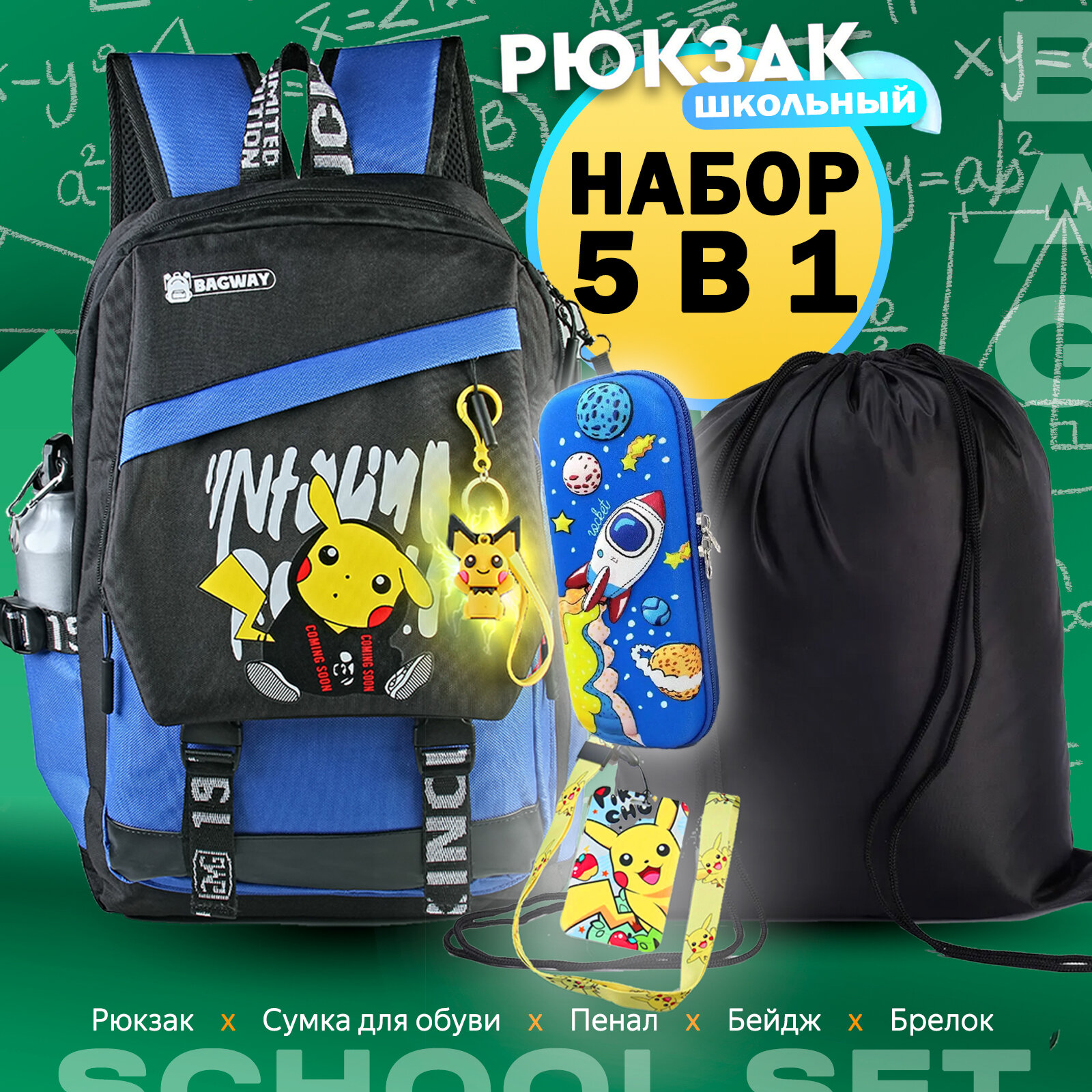 10 цен на Рюкзак Bagway детский школьный "Пикачу", комплект 5 в 1 (пенал, мешок для обуви, зарядка USB, брелок для ключей), синий