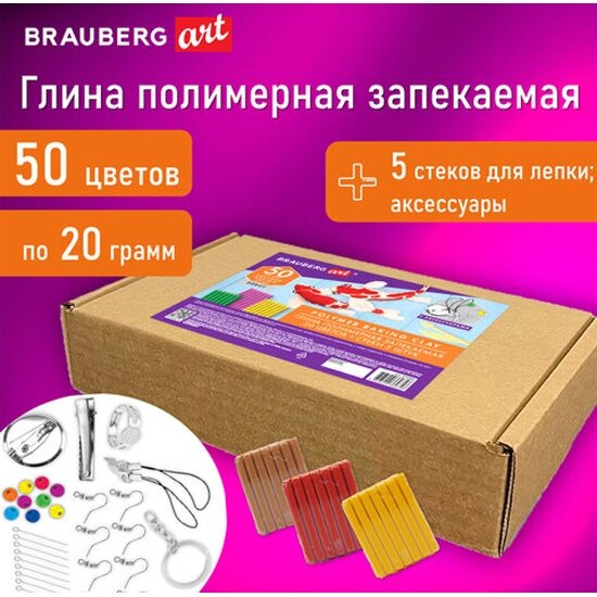 Глина полимерная BRAUBERG запекаемая, набор 50 цветов по 20 г, с аксессуарами, в гофрокоробе, , 271161