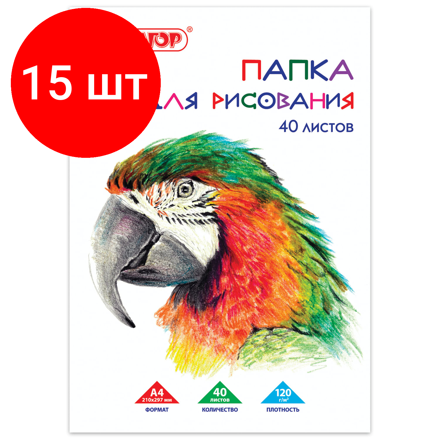 10 цен на Комплект 15 шт, Папка для рисования, А4, 40 л., 120 г/м2, пифагор, 210х297 мм, "Попугай", 129222