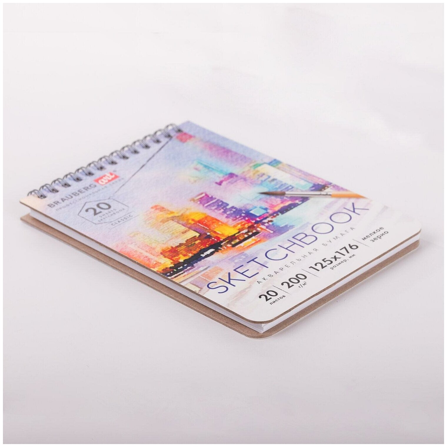 Блокнот-Скетчбук с белыми акварельными страницами для рисования эскизов 200г 125х176мм, 20л, мелкое зерно, гребень, Brauberg Art Classic информация: