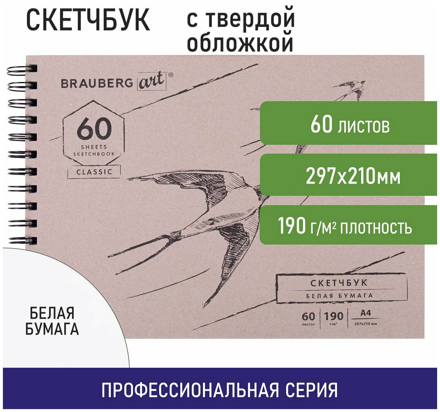 Скетчбук, белая бумага 190 г/м2, 297х210 мм, 60 л., гребень, твердая обложка, BRAUBERG ART CLASSIC, 113853