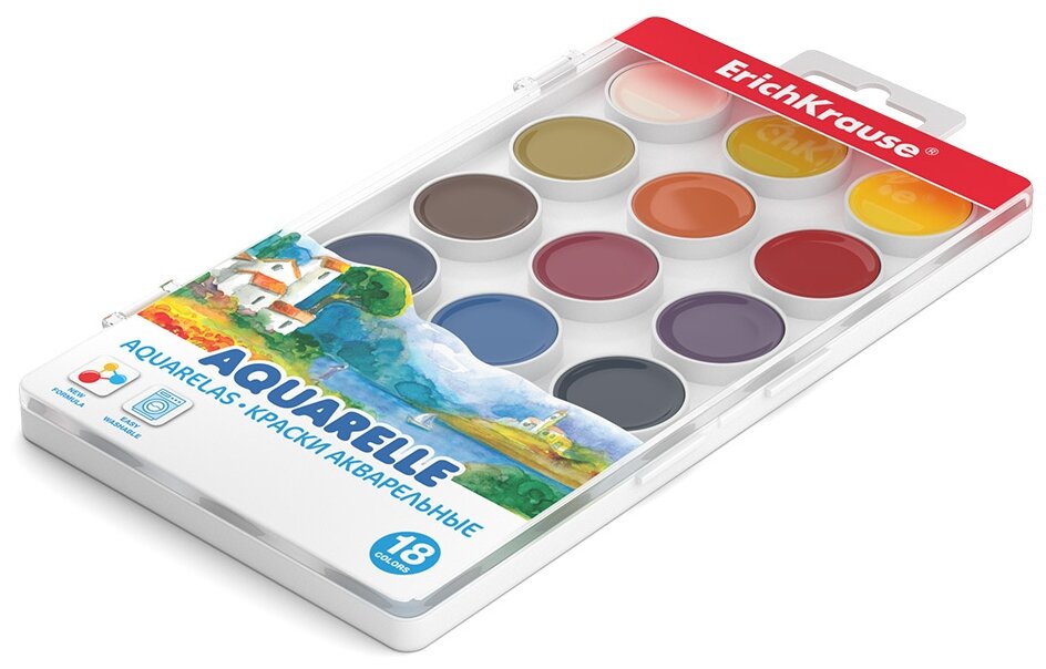 | Комплектация | Краски акварельные Erich Krause "Basic", 18 цветов, без кисти, пластиковая упаковка |