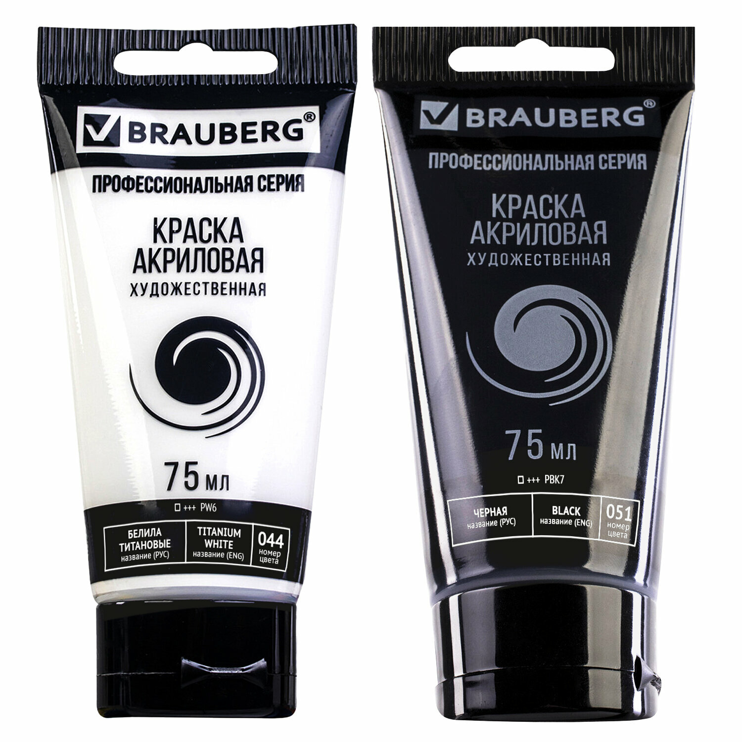 Акриловые краски художественные белые черные, белила глянцевые акрил набор 2 шт для рисования по холсту, дереву 75 мл в тюбиках, Brauberg Art, 192421 информация: