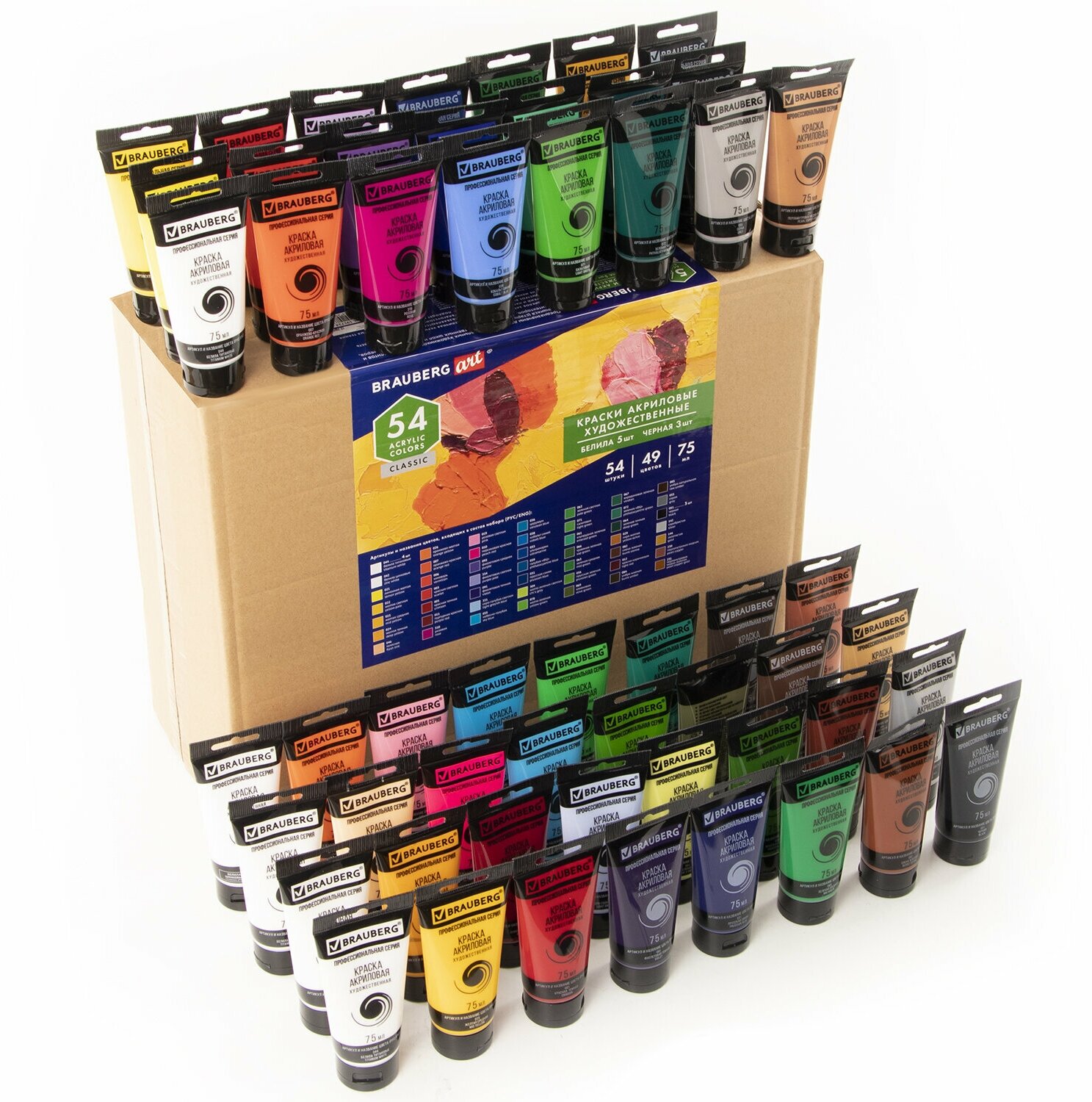 Краски акриловые художественные BRAUBERG ART CLASSIC, набор 54 шт, 49 цветов, в тубах 75 мл