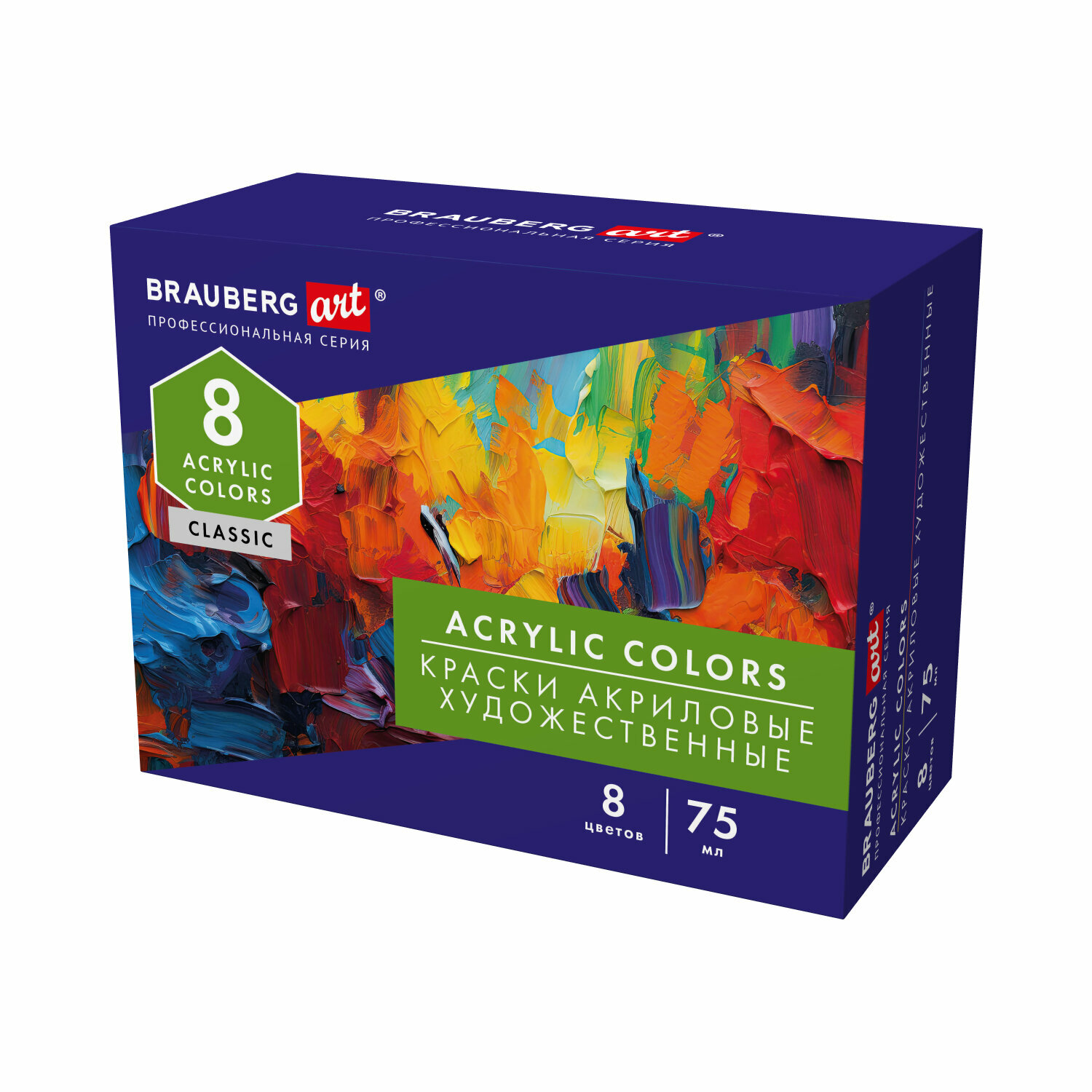 Акриловые краски художественные глянцевые акрил набор 8 цветов для рисования по холсту, дереву по 75 мл в тюбиках, Brauberg Art Classic, 192425 информация: