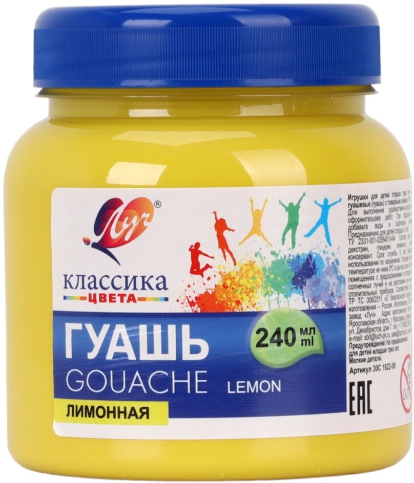 Гуашь художественная 1 шт. ЛУЧ "Классика", 240 мл, лимонная, 30С 1822-08