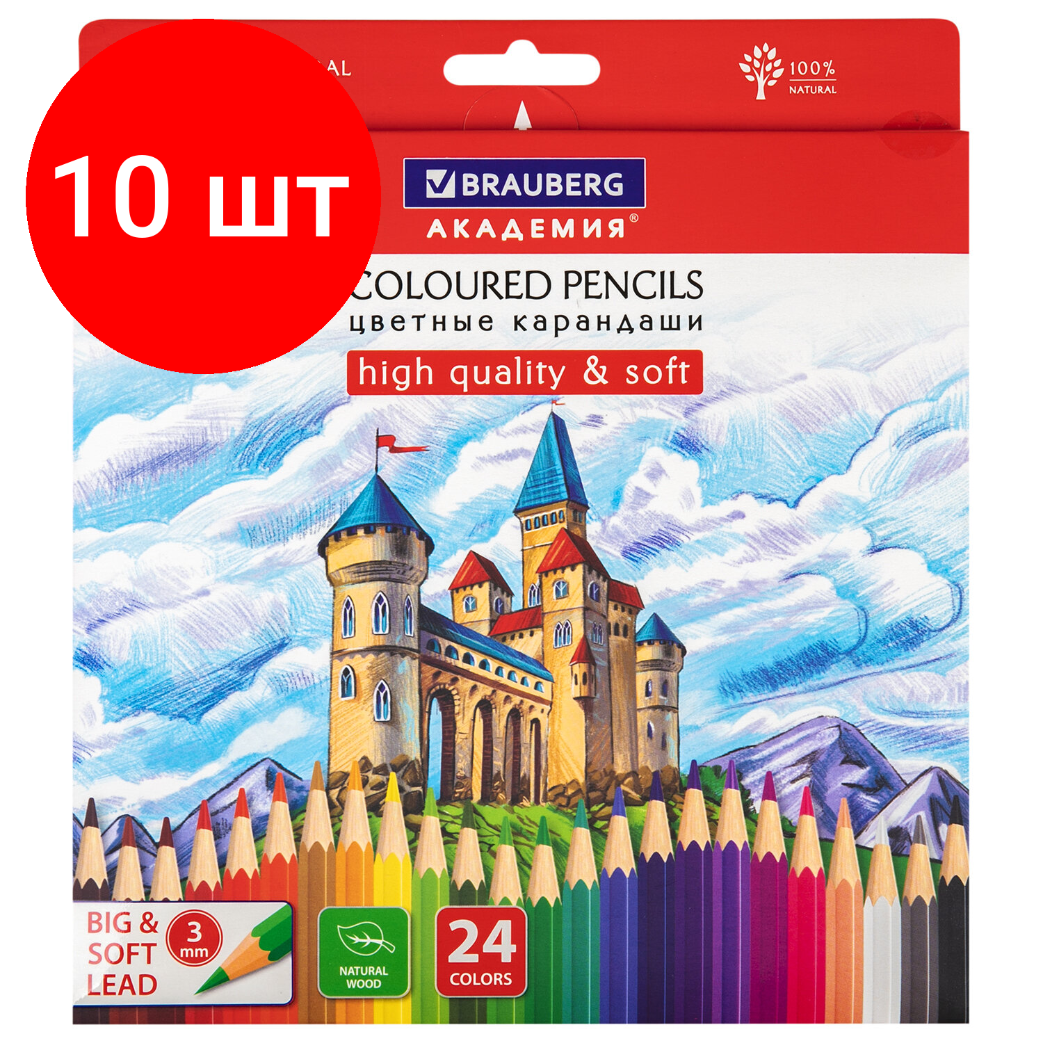 10 цен на Комплект 10 шт, Карандаши цветные мягкие BRAUBERG академия, 24 цвета, шестигранные, грифель 3 мм, 181866