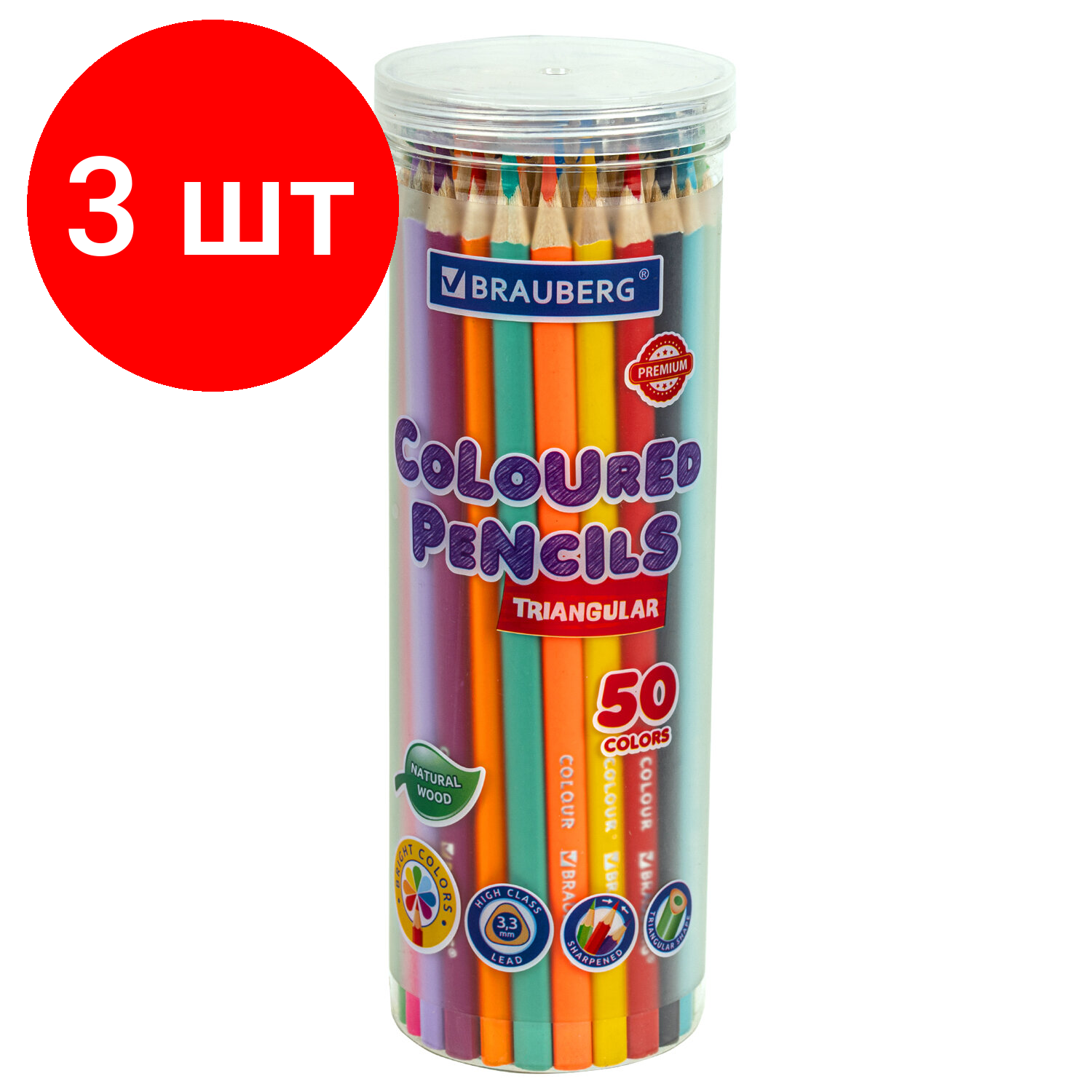 Отзывы на Комплект 3 шт, Карандаши цветные BRAUBERG PREMIUM 50 цветов в тубе, трехгранные, мягкий грифель 3.3 мм, 181935
