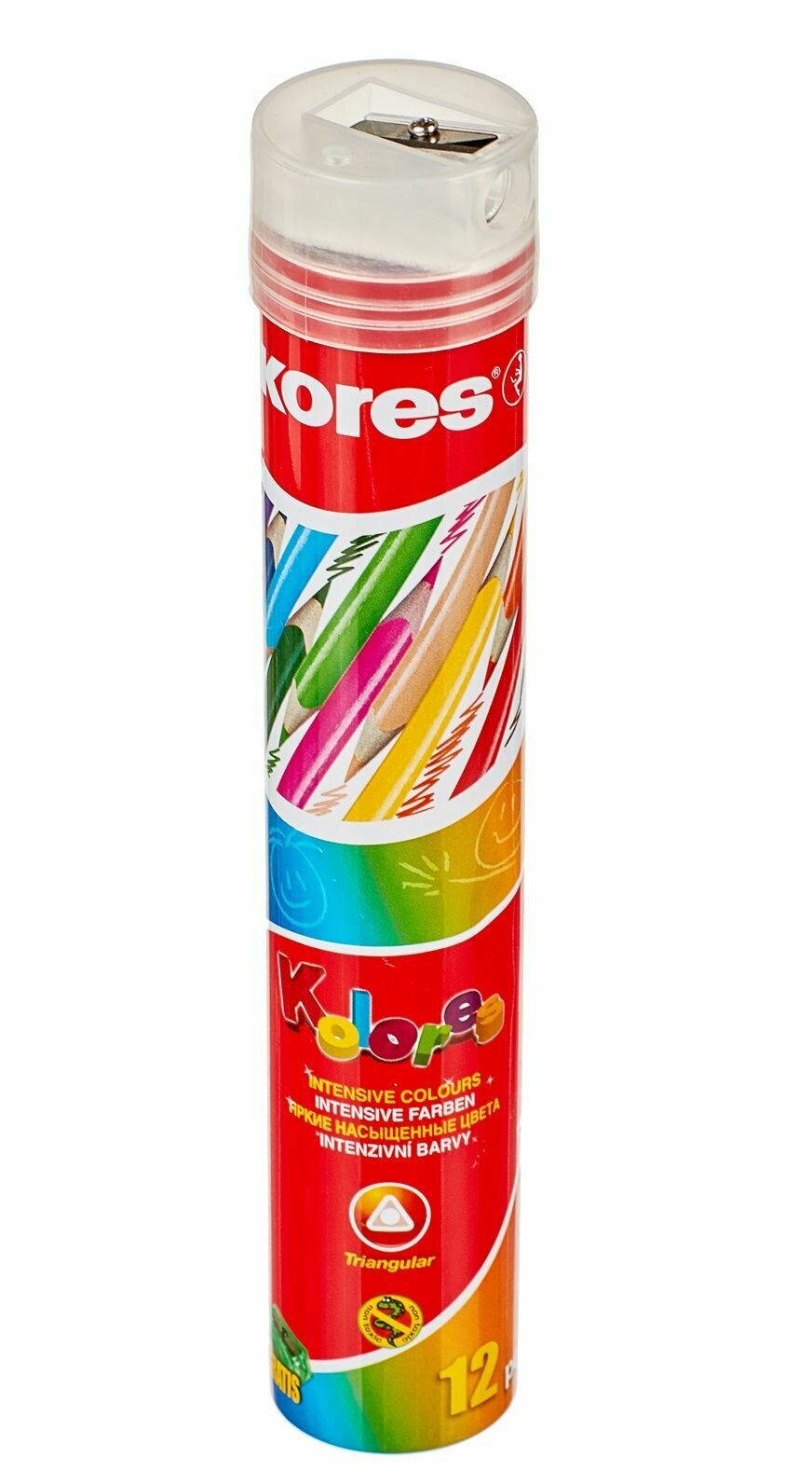 Карандаши цветные Kores, трехгранные, толщина грифеля 3 мм, набор 12 цветов+точилка информация: