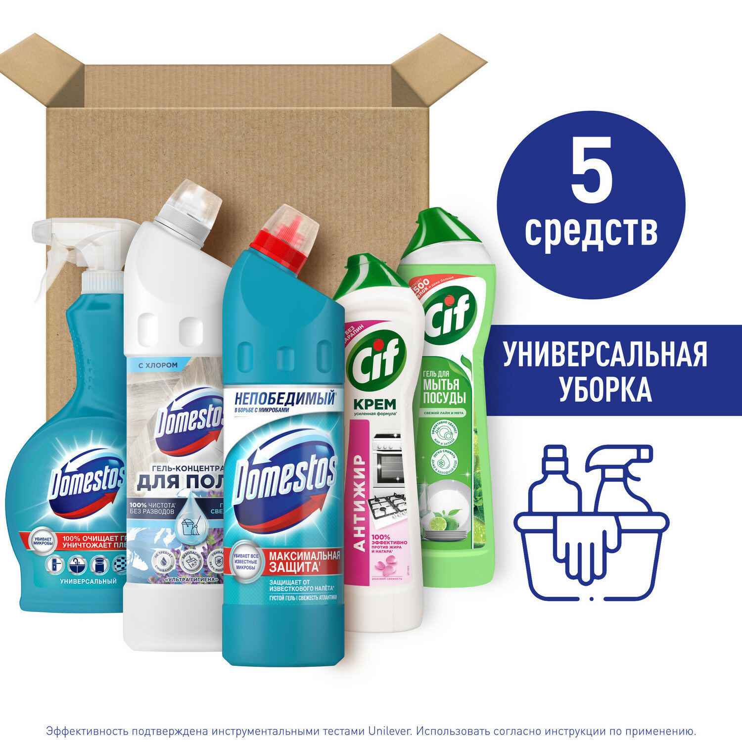 | Подробная комплектация | Domestos средство для мытья пола и других поверхностей ультра гигиена 1000мл, Domestos средство универсальное свежесть атлантики 750мл, Domestos универсальное средство спрей 500мл, Cif крем чистящий розовая свежесть 500мл, Cif средство для ручного мытья посуды 500мл |
