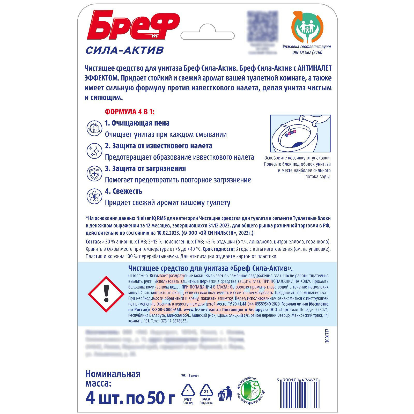 Набор блоков-освежителей для унитаза Бреф Сила-Актив Цветочная свежесть, 4шт информация: