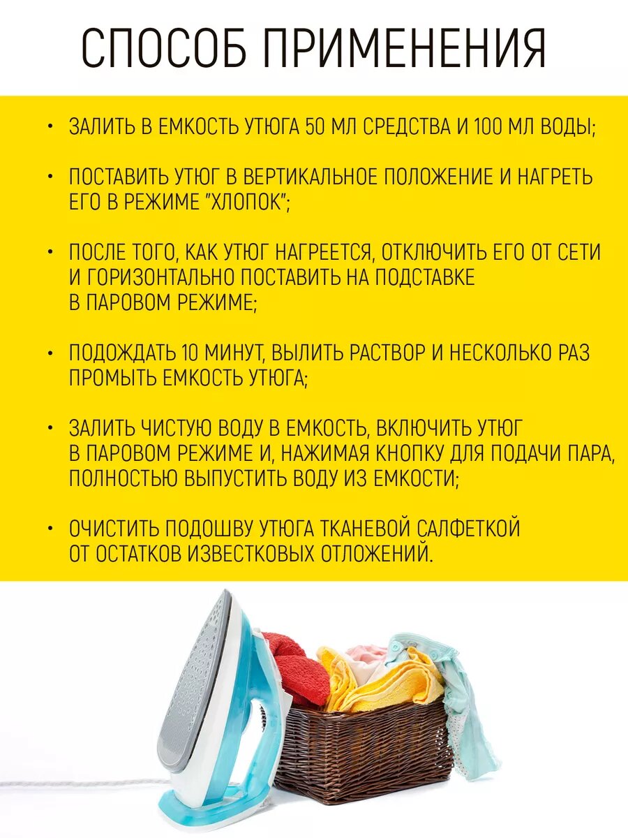 | Способ применения | 1) Залить в емкость утюга 50 мл средства и 100 мл воды; 2) Поставить утюг в вертикальное положение и нагреть его в режиме "хлопок"; 3) После того, как утюг нагреется, отключить его от сети и горизонтально поставить на подставке в паровом режиме; 4) Подождать 10 минут, вылить раствор и несколько раз промыть емкость утюга; 5) Залить чистую воду в емкость, включить утюг в паровом режиме и, нажимая кнопку для подачи пара, полностью выпустить воду из емкости; 6) Очистить подошву утюга тканевой салфеткой от остатков известковых отложений. |