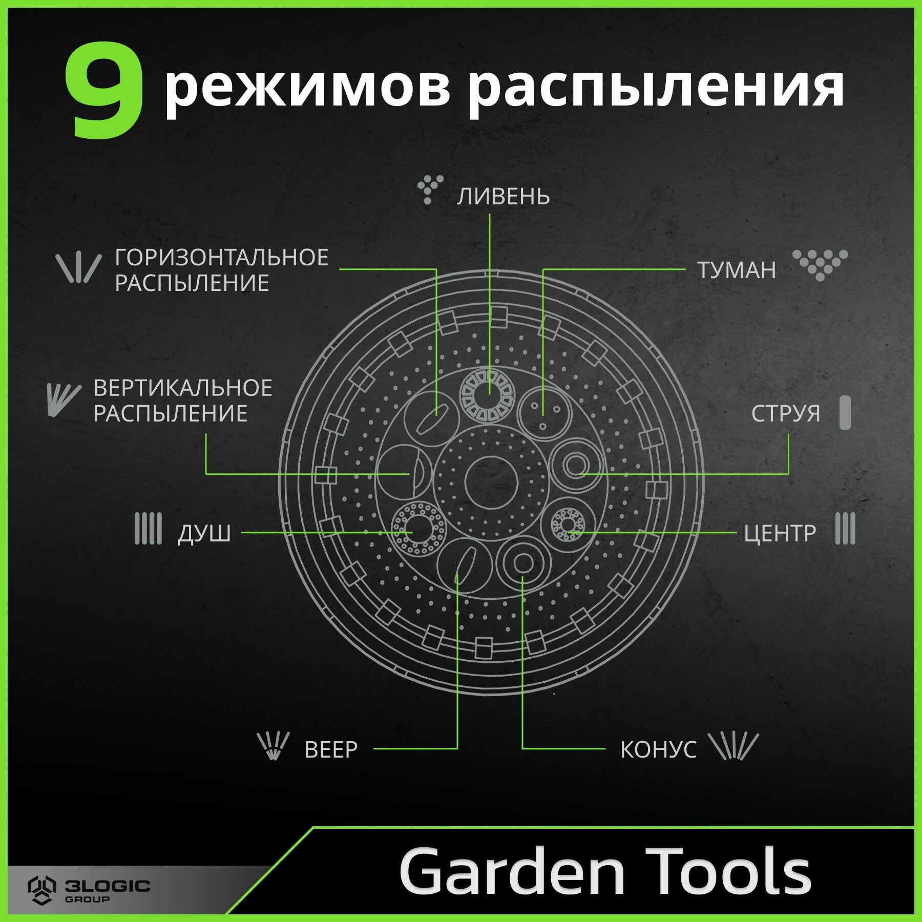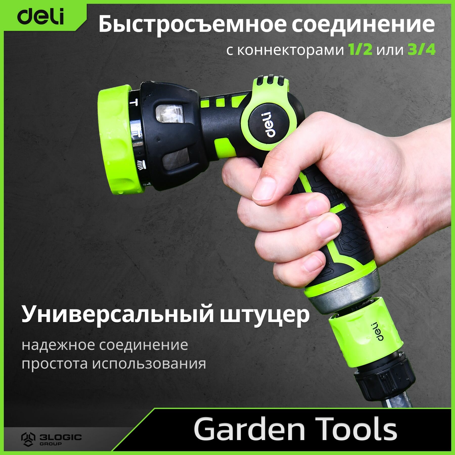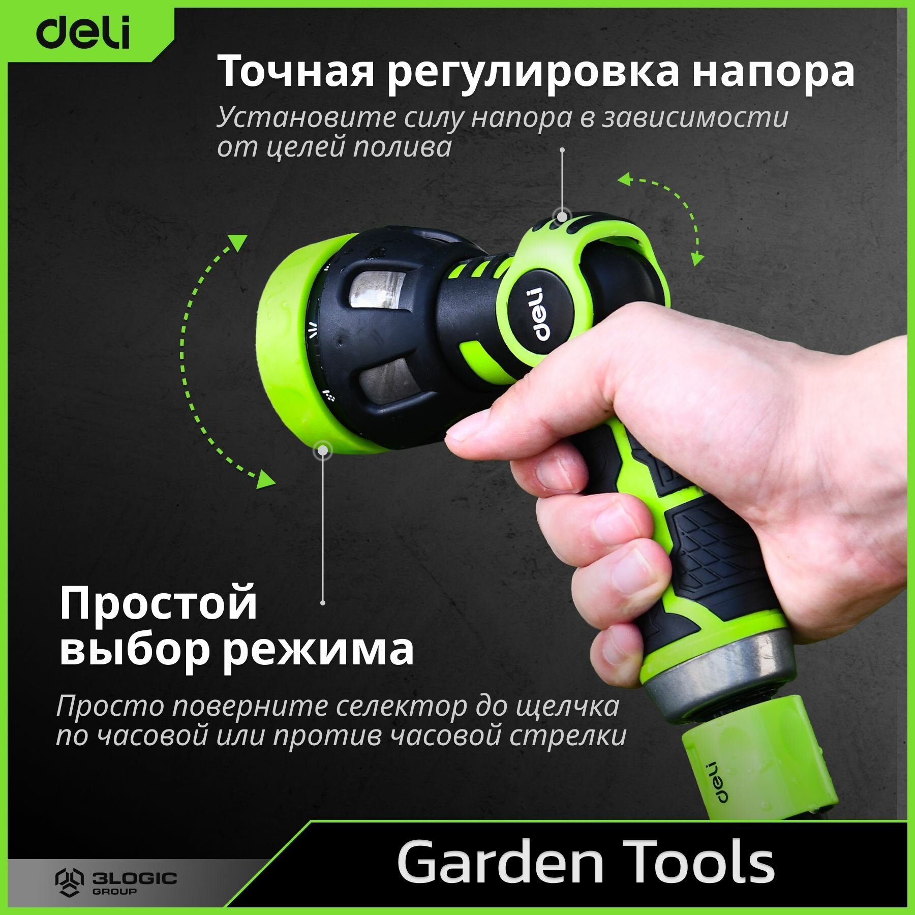 Пистолет-распылитель поливочный бескурковый Deli DL8762 (9 режимов распыления, цинковый корпус, фиксатор курка, прорезиненная рукоять) информация: