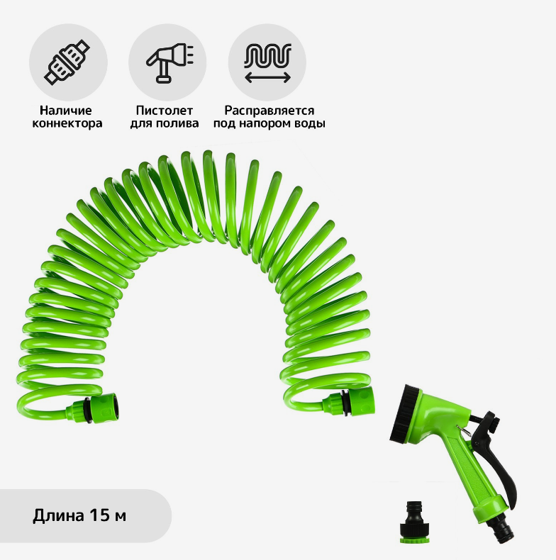 Шланг поливочный спиральный, 15 м, быстросъёмный, с поливочным пистолетом и штуцером, зелёный, Greengo информация: