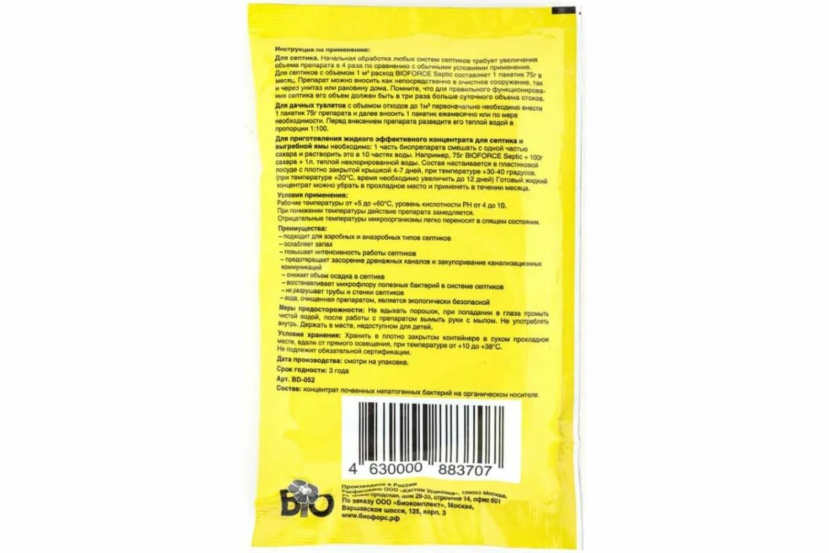 Бактерии для септиков и дачных туалетов BIOFORCE Septic 75г. комплект информация: