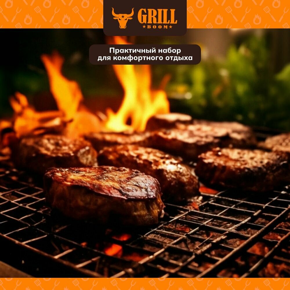 Отзывы на Набор для гриля GRILLBOOM, в наборе щипцы, лопатка, нож, вилка, кисть , в защитном чехле