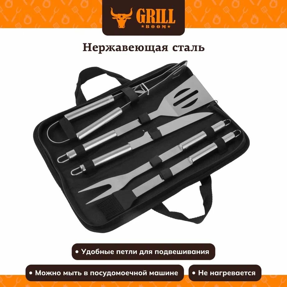 10 цен на Набор для гриля GRILLBOOM, в наборе щипцы, лопатка, нож, вилка, кисть , в защитном чехле