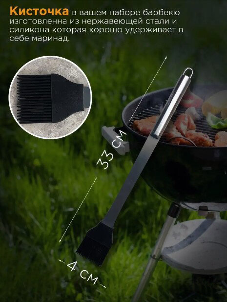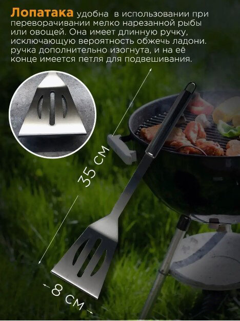 | Длина | вилка для мяса 35 см, кисточка 33.50 см, лопатка 35 см, нож для мяса 32 см, щипцы 35 см |