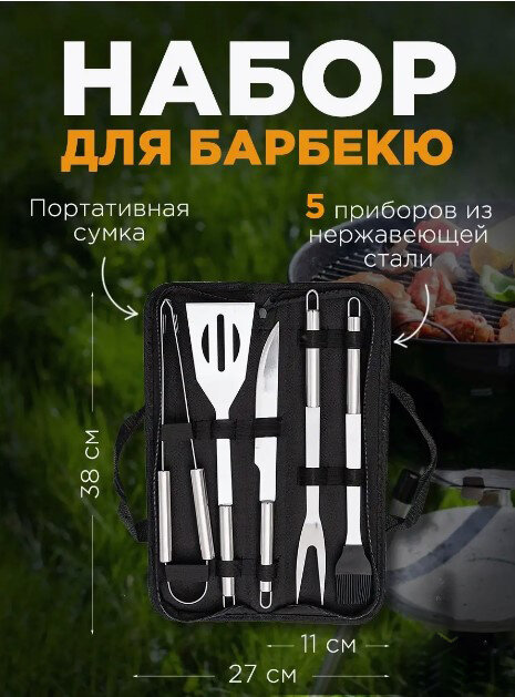 Набор для барбекю 5 предметов с чехлом BBQ / Инструменты для гриля, мангала 5 шт. из нержавеющей стали/ Подарочный набор для шашлыка в чехле информация: