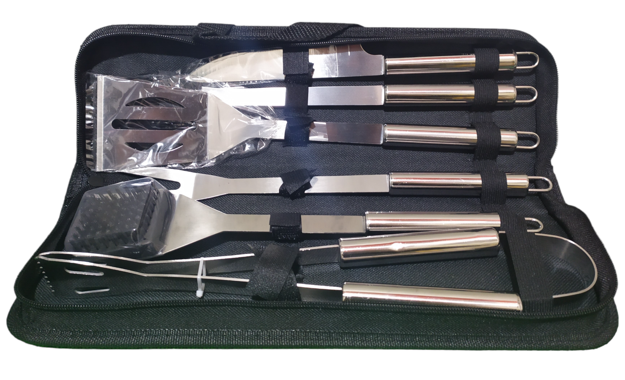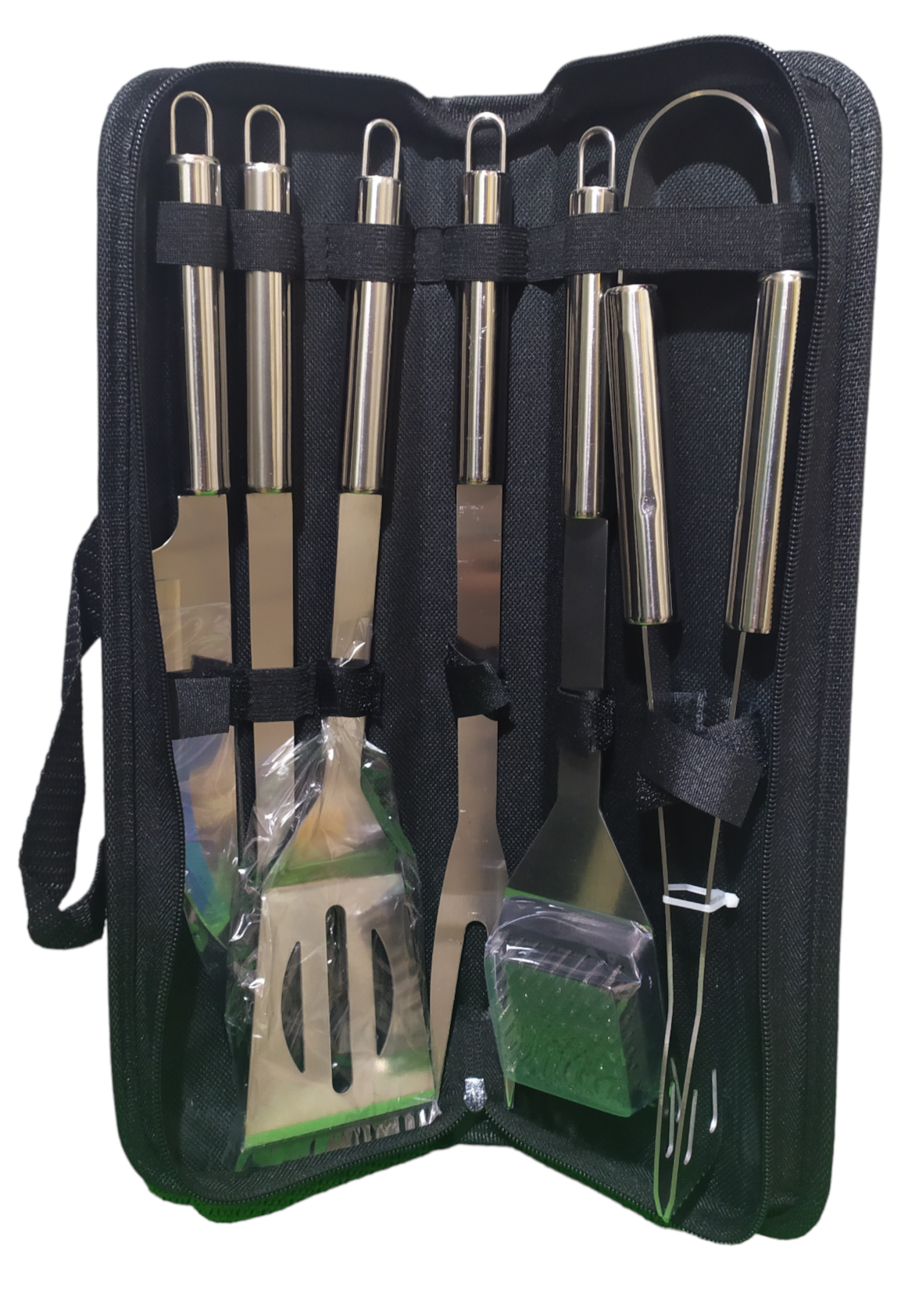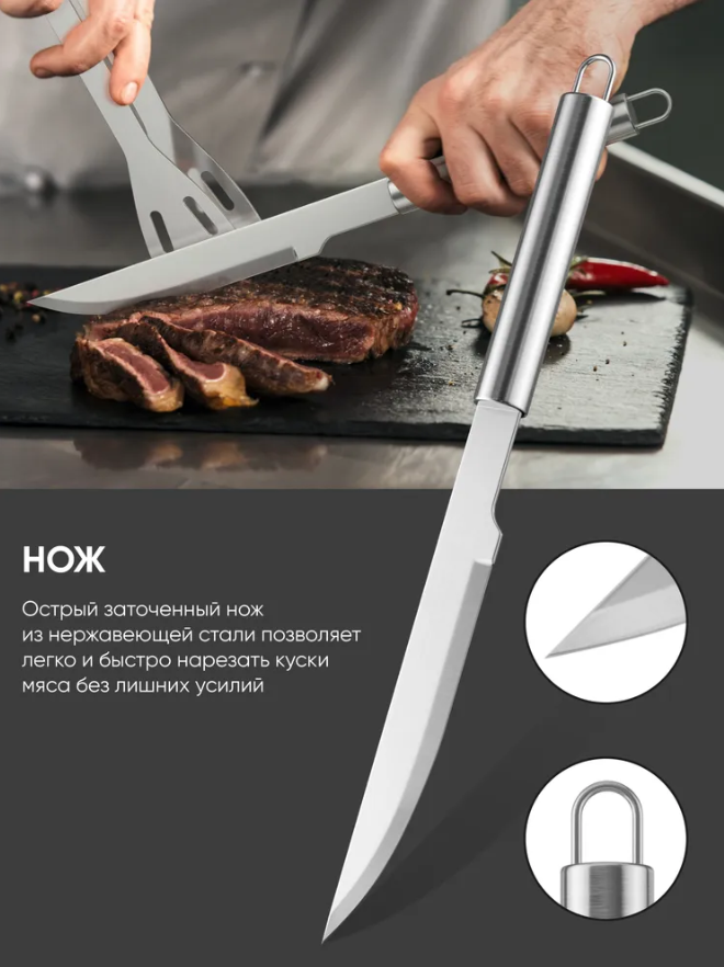 | Длина | вилка для мяса 35 см, кисточка 33 см, лопатка 35 см, нож для мяса 32 см, щипцы 35 см, щетки 35 см |
