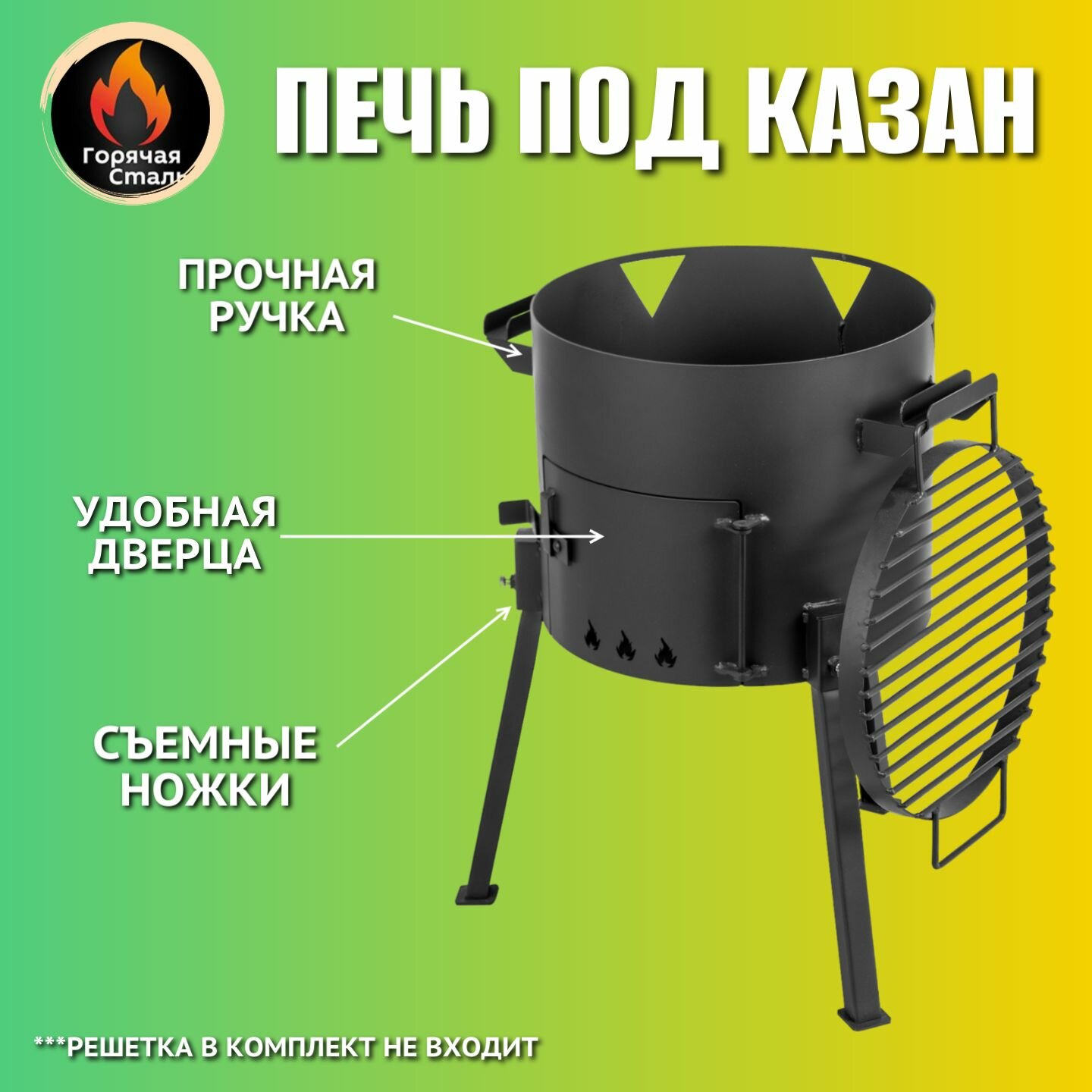 Печь для казана объемом 10 литров с ручками, съемные ножки, зольник