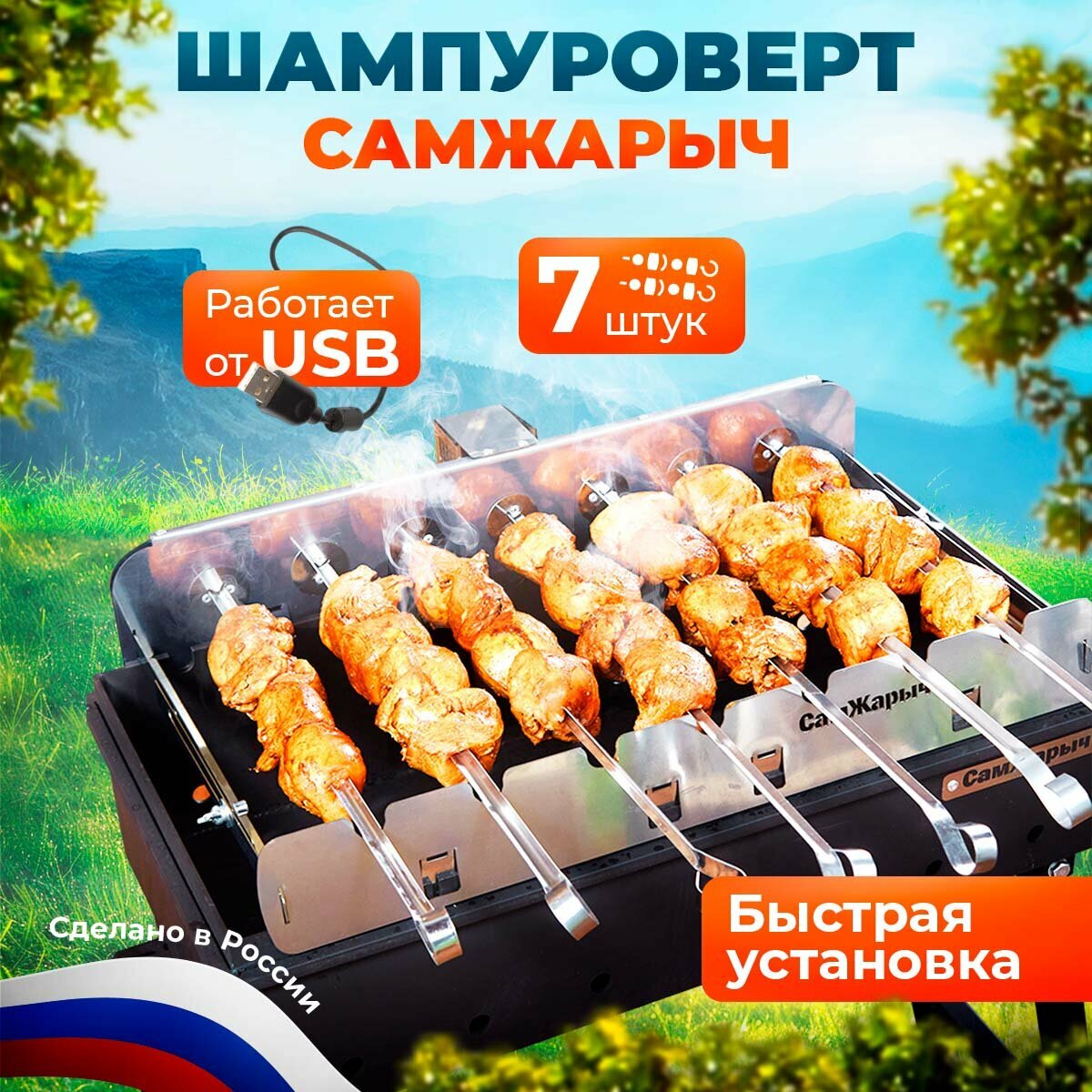 | Комплектация | Мотор 6 В - 1 шт, Механизм вращения - 1 шт, Удерживающая планка - 1 шт, Шампура - 7 шт, Провод USB - 1 шт, Удерживающая штанга - 2 шт, Сумка - 1 шт |