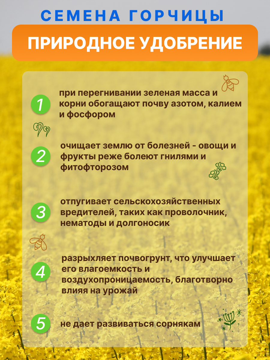 Дополнительная информация | био удобрение, сидерат, для посадки на огороде, семена горчицы желтой, микрозелень |