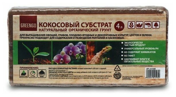 | Состав | Субстрат Greengo кокосовый, универсальный, натуральный грунт для террариумов и растений, в брикете, 7 л при разбухании |