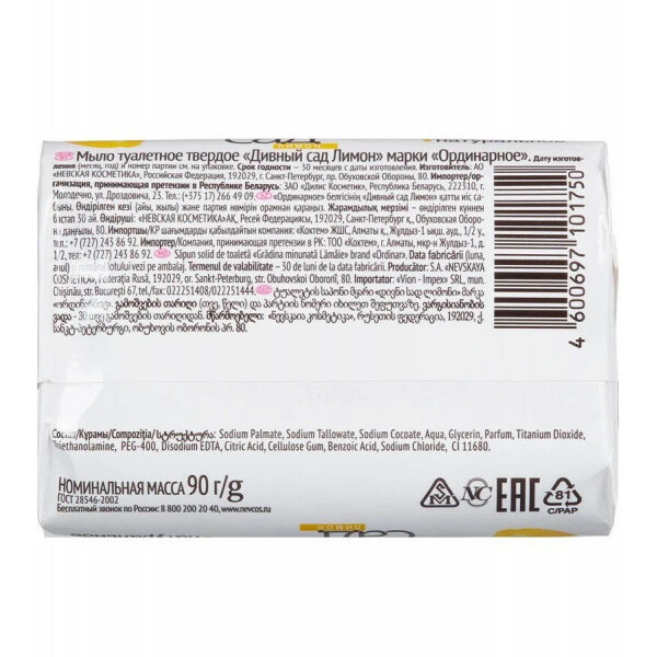 Мыло кусковое туалетное Невская Косметика "Дивный сад. Лимон", 90г, бумажная обертка (10175), 6шт.