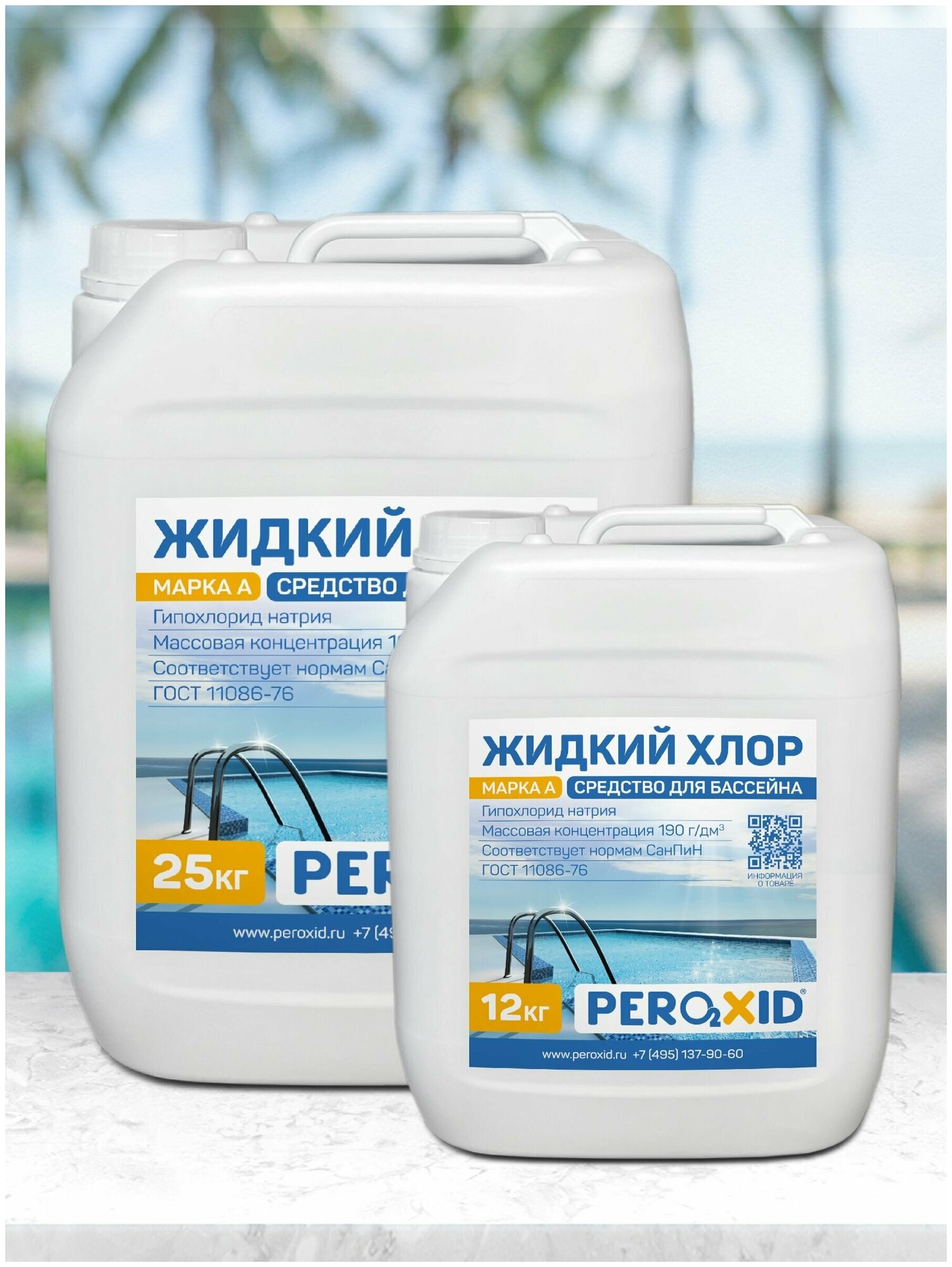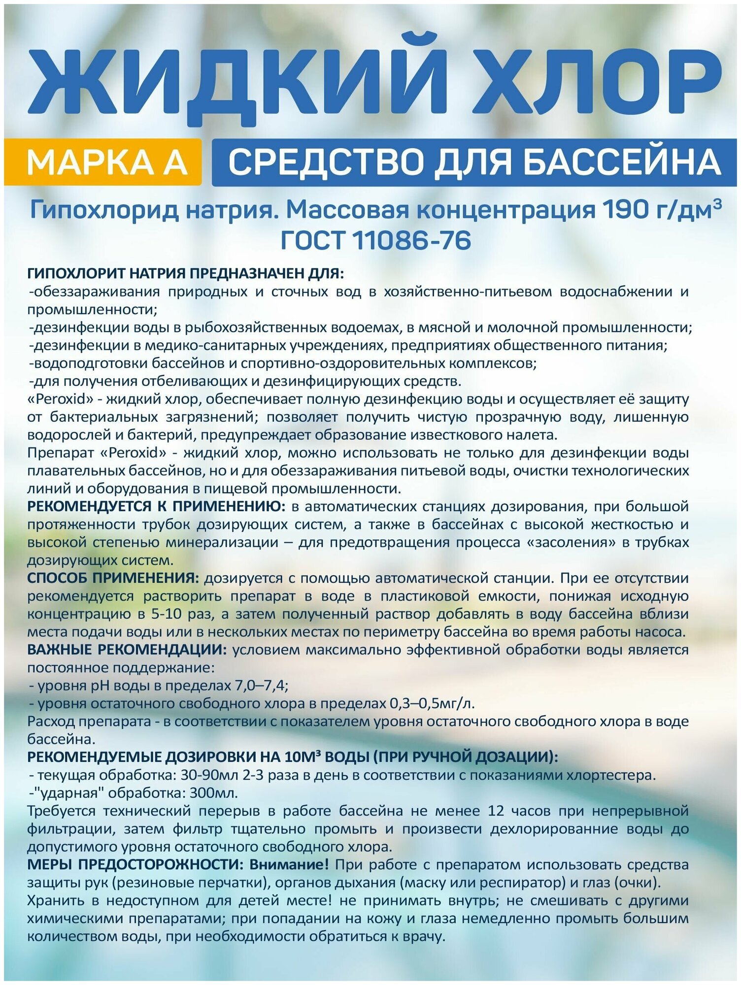 Жидкий хлор для бассейна PEROXID Гипохлорит натрия ГОСТ 11086-76 марка А канистра 10 л/12 кг информация: