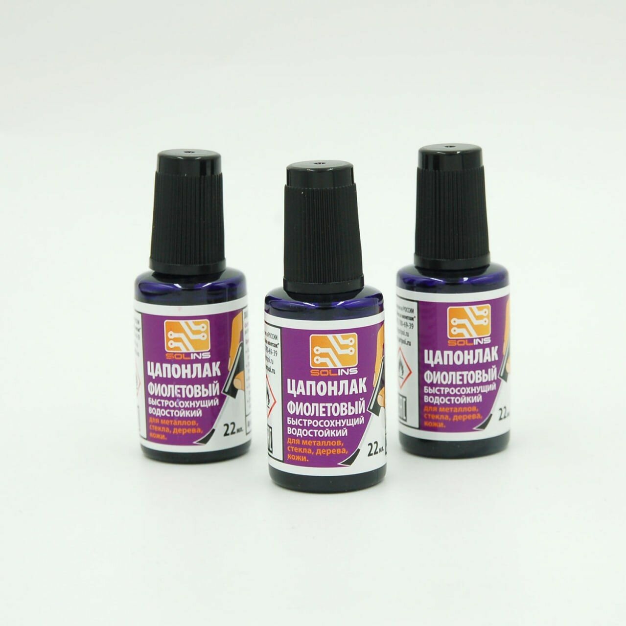 Цапон лак Solins быстросохнущий водостойкий, защитный для металла, стекла ламп, дерева, печатных плат / Цапонлак защита от коррозии для наружных и внутренних работ, фиолетовый набор 3 шт. по 22 мл информация: