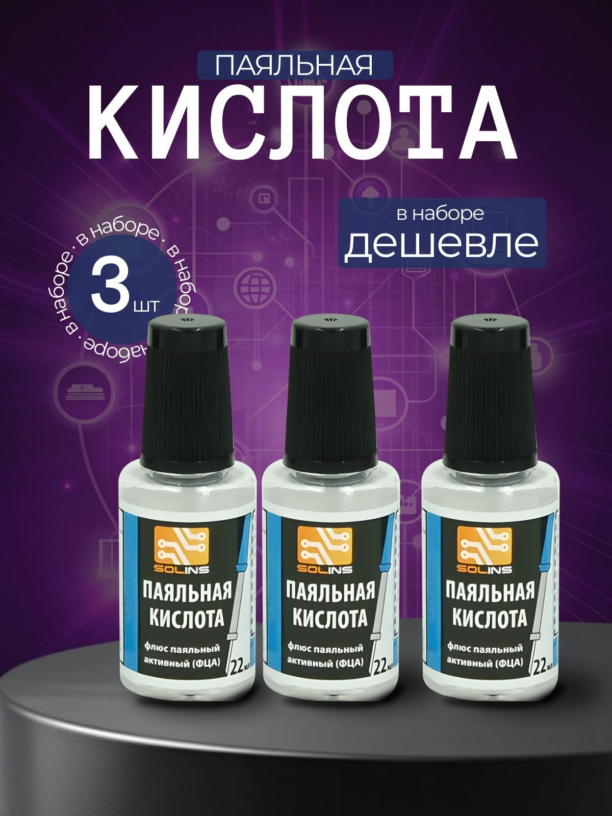 Паяльная кислота Solins ФЦА, активный флюс для пайки меди, стали, никеля, флакон с кисточкой, набор 3 шт. по 22 мл