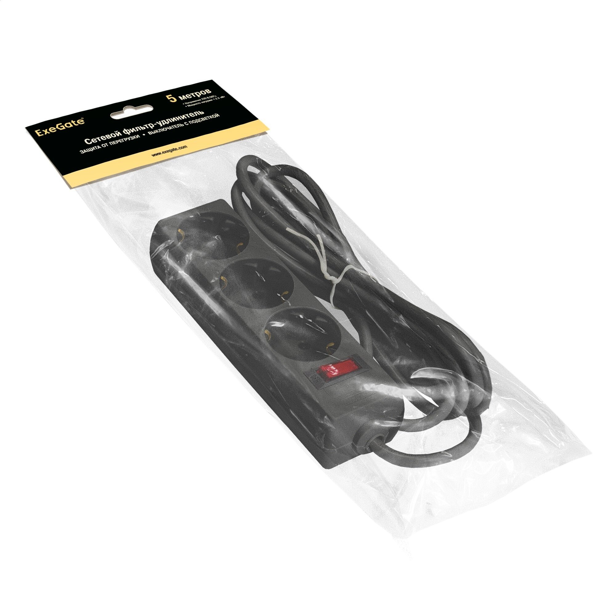 Сетевой фильтр ExeGate SP-3-5B 3 евро с заземлением, 5м, выключатель с подсветкой, черный 221182