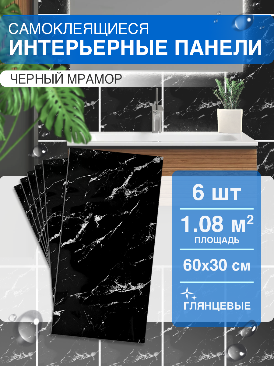 Самоклеящиеся панели ПВХ. Плитка для стен. Бело-черный мрамор 6 шт 1 090 ₽