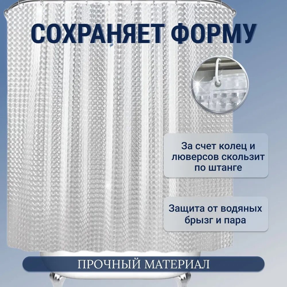 Штора для ванной комнаты с кольцами и люверсами, 3D эффект/PEVA материал/ для душа/ Из водоотталкивающего полиэстера/Полупрозрачный цвет/ 180х180 см информация: