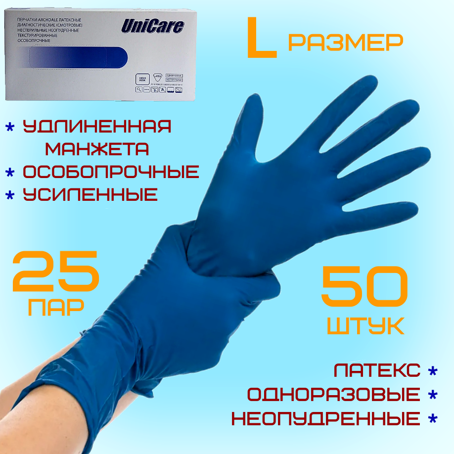 Перчатки латексные Unicare одноразовые усиленные, удлиненная манжета, цвет синий 50 шт информация: