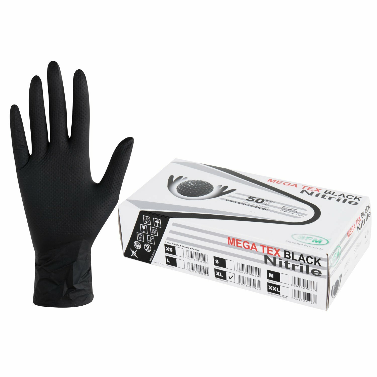 10 цен на Перчатки нитриловые SFM сверхпрочные, с текстурой mega tex black, 25 пар, XL