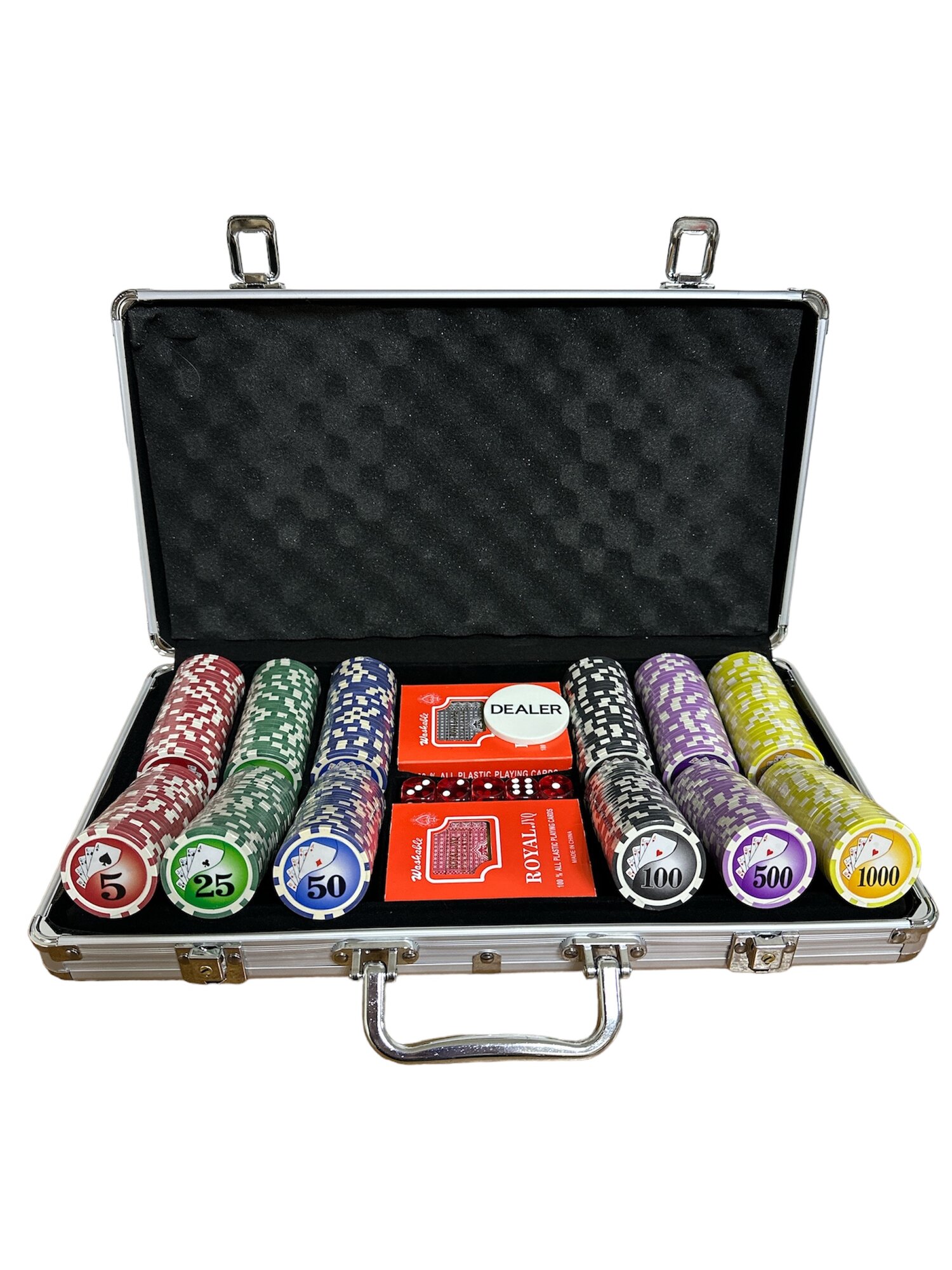 | В наборе | 300 фишек с номиналом, сукно, 2 колоды карт, фишка одна Dealer, 5 игральных костей |