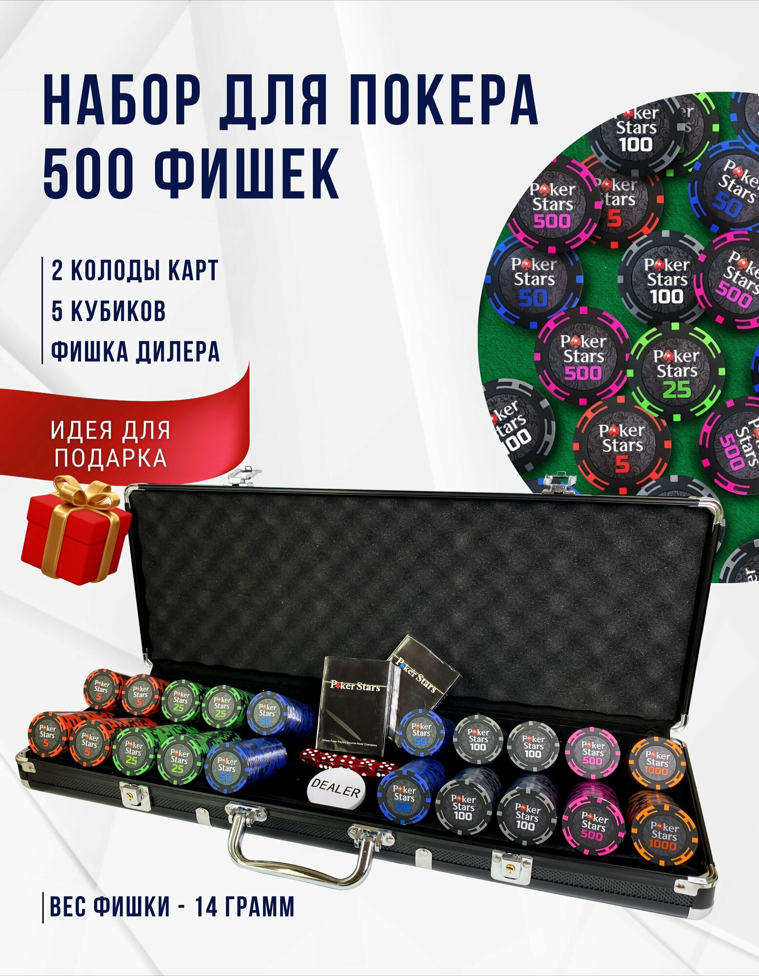 Набор для покера Poker Stars, 500 фишек 14 г с номиналом в чемодане с сукном в подарок