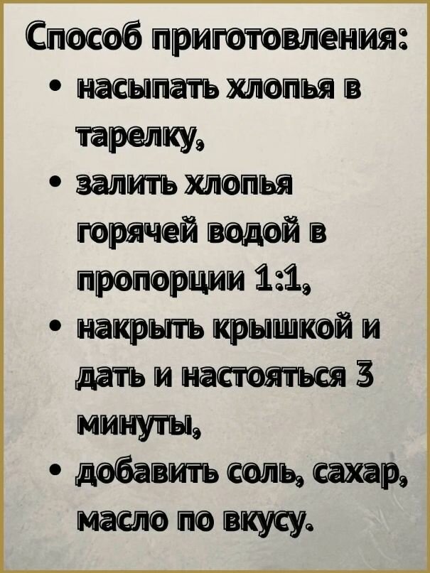 | Состав | хлопья рисовые / овсяные / гречневые / ржаные / пшеничные / пшенные / куцкурузные / полбяные / пшенные |