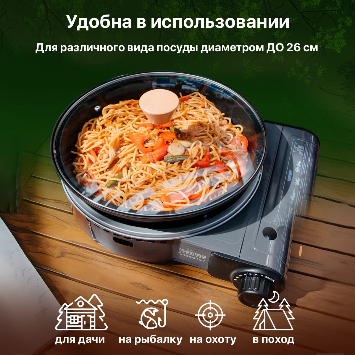 Газовая плита туристическая следопыт - Magma" со сковородой и крышкой / Плитка настольная с переходником в чехле / Горелка портативная в поход информация: