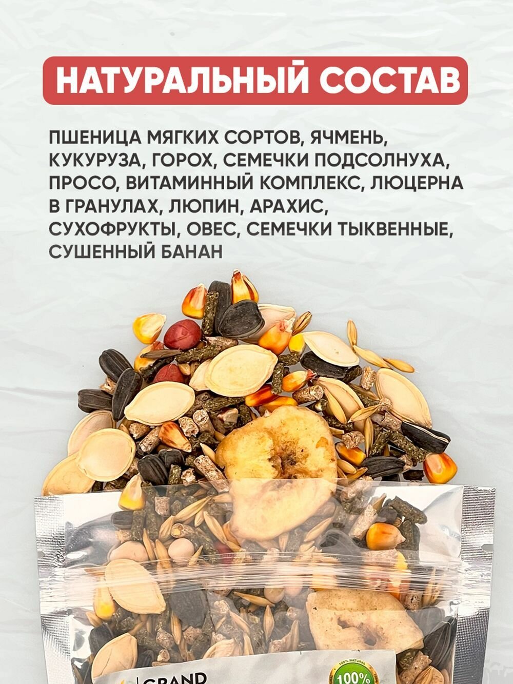 | Состав | Пшеница мягких сортов, ячмень, кукуруза, горох, семечки подсолнечника, просо, витаминный комплекс, люцерна в гранулах, люпин, арахис, овес, семечки тыквенные, сушенный банан |