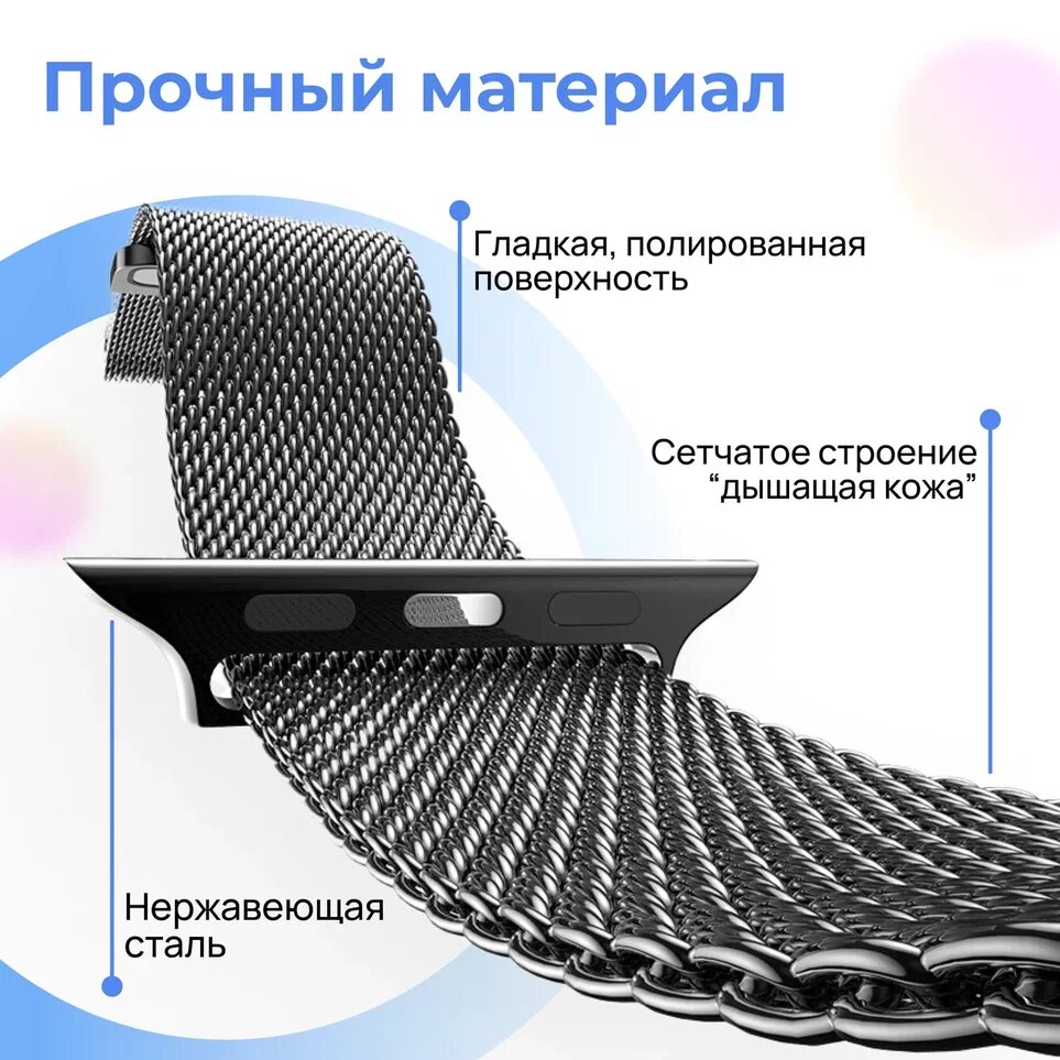 Металлический ремешок для умных часов Apple Watch 42-44-45-49 mm / Сменный браслет миланская петля для часов Эпл Вотч 1-9, SE, Ultra серии / Черный 400 ₽