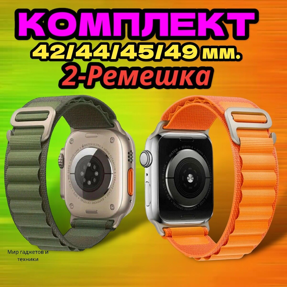 10 цен на Комплект тканевых ремешков для Apple Watch 42/44/45/49mm, series 1 2 3 4 5 6 7 8 /SE/SE 2022, Apple Watch Ultra (для эпл вотч) зеленый/оранжевый