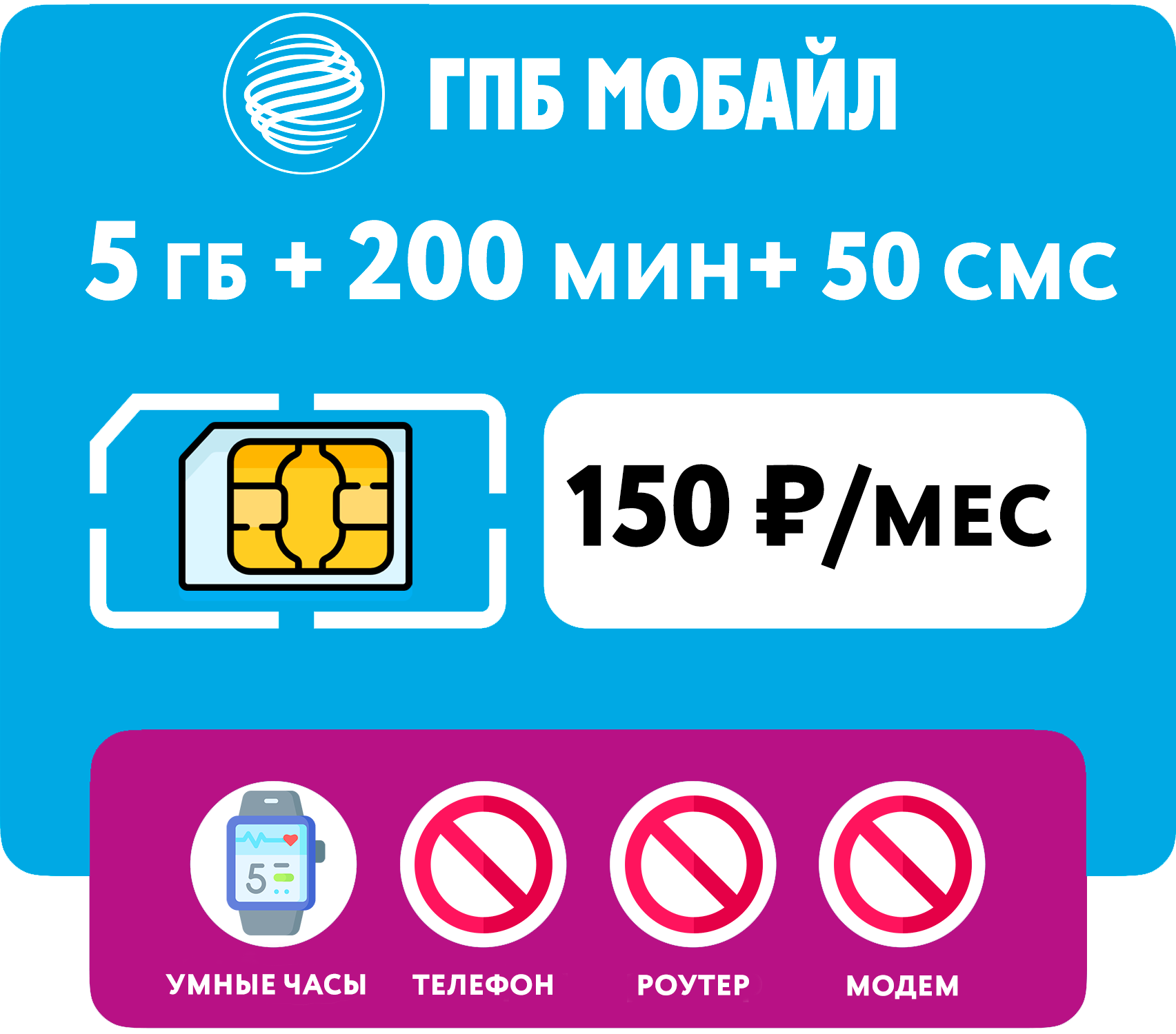 10 цен на SIM-карта 5 гб интернета, 200 мин, 50 смс за 150 руб/мес для умных часов (Москва, Московская область, Россия)