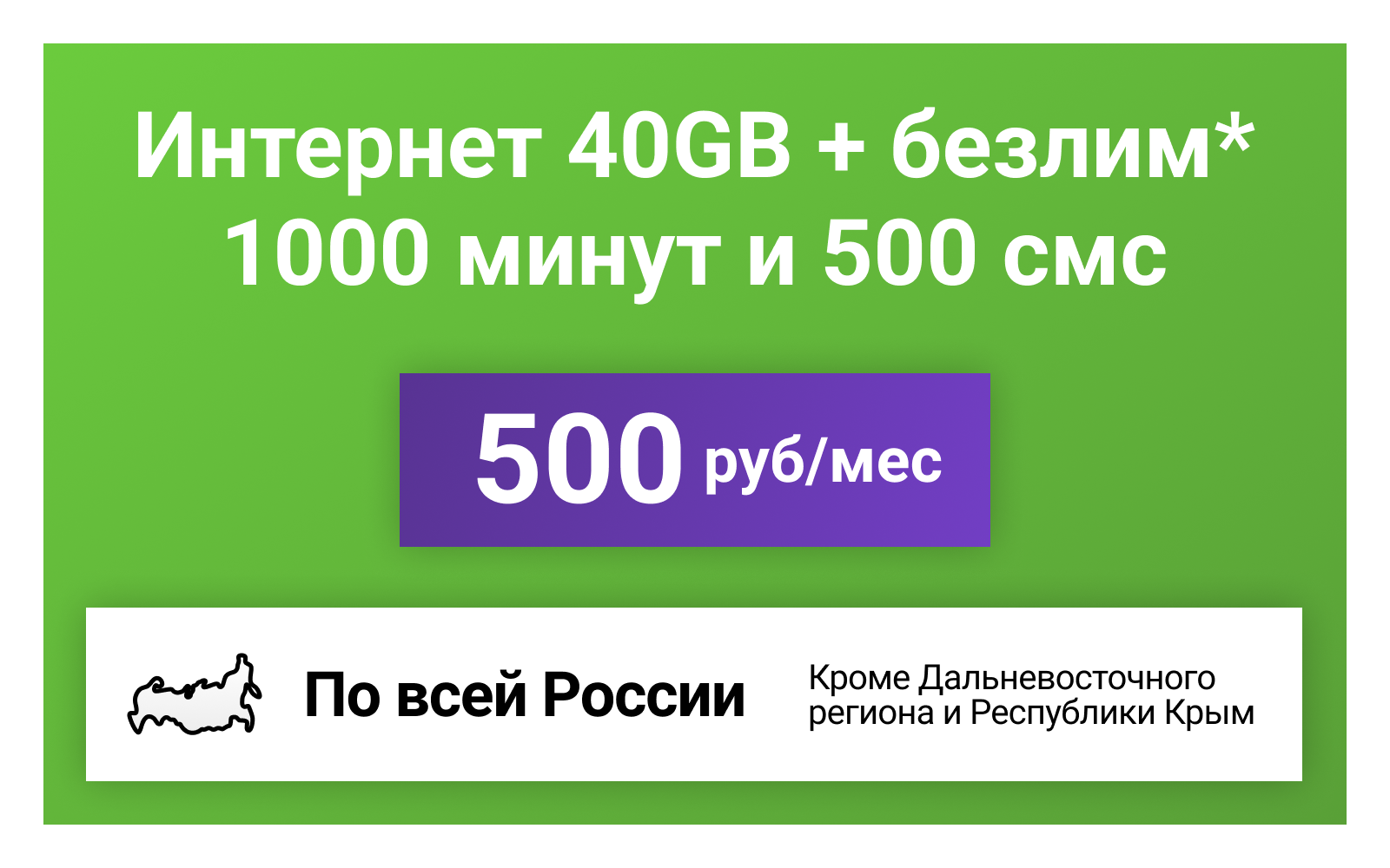 Сим-карта / 1000 минут + 500 смс + 40GB + безлимит на мессенджеры - 500 р/мес, тариф для смартфона (Вся Россия) информация: